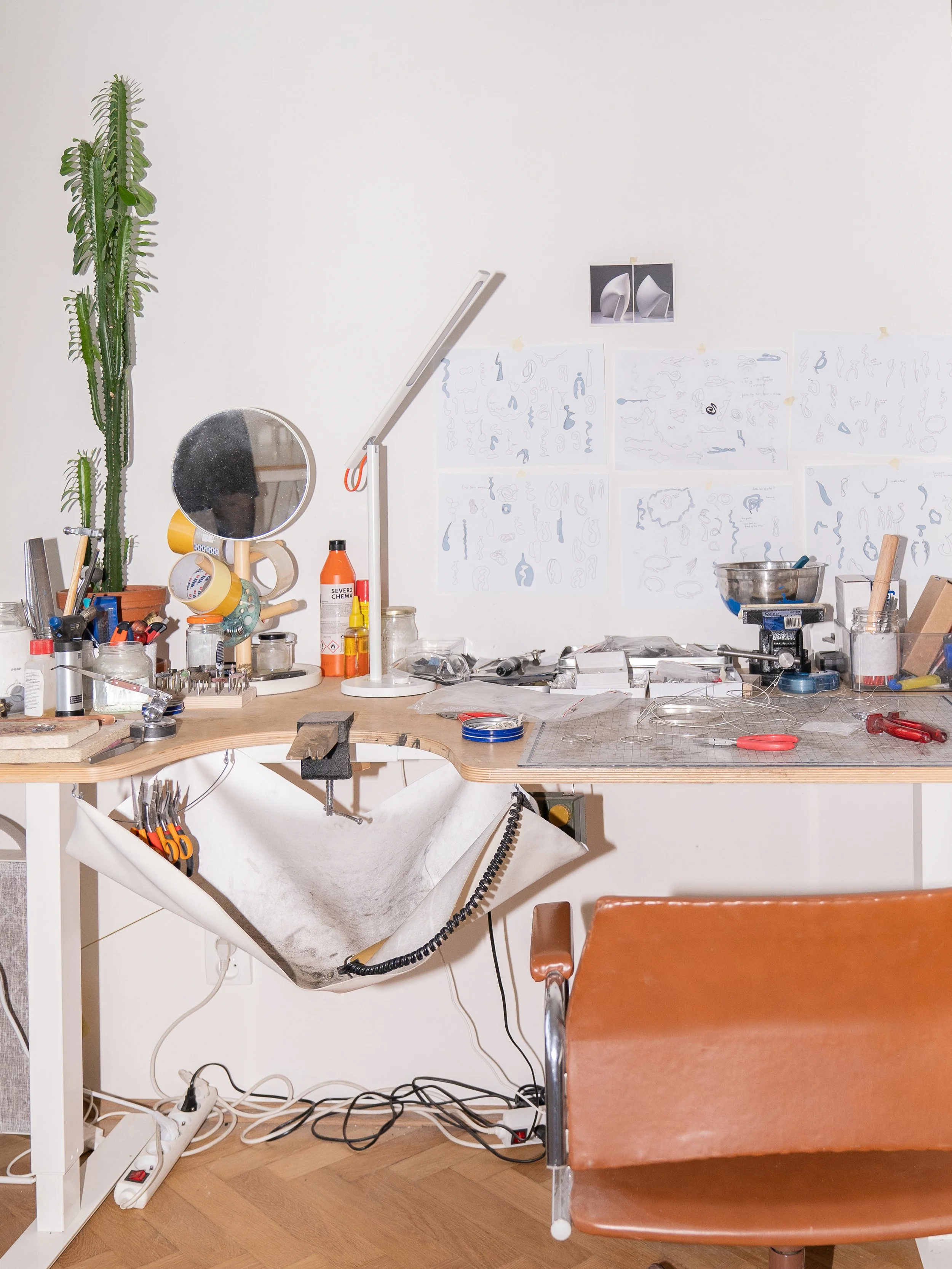 With minimal sketching, I shape my materials slowly, allowing the process itself to guide the outcome. I think of it as sculpting in clay or silver, often choosing not to use molds or templates. This leaves space for an experimental, intuitive dance between hands and materials.